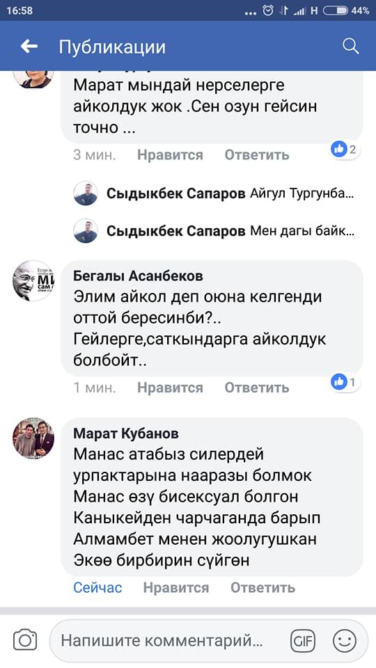 Тилекке каршы арасында "тантыктарда" жок эмес. Алсак бүгүн Фейсбуктагы тайпалардын бирине "Бишкекте гейлерди кордошууда. Кыргыз элим гейлерге ырайым кылалы. Улуу элбиз"-деген билдирүүнү Марат Кубанов калтырган. Эми бул талкуунун башталышы гана.