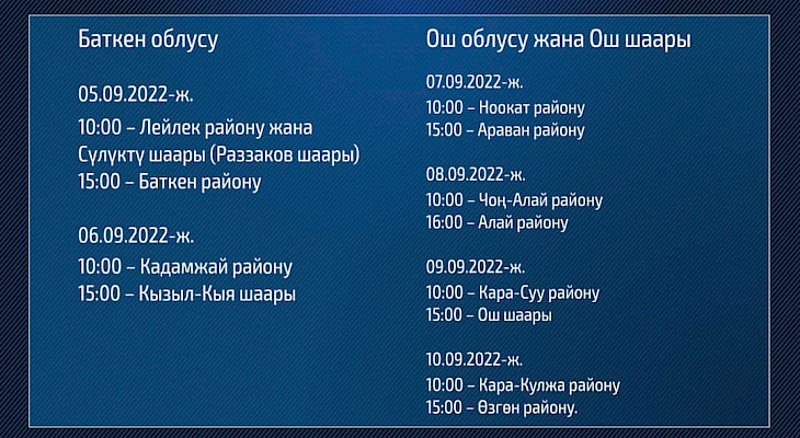 10-сентябрь, саат 10:00дө Кара-Кулжа районунда, 15:00дө Өзгөн районунда.
