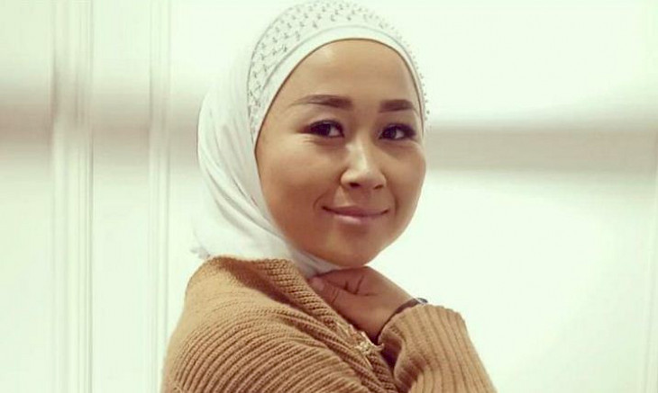 Кийген кийимдери: үстүнө күрөң түстөгү көйнөк, астында күрөң түстөгү шым, башында ак түстөгү жоолук (хиджаб).