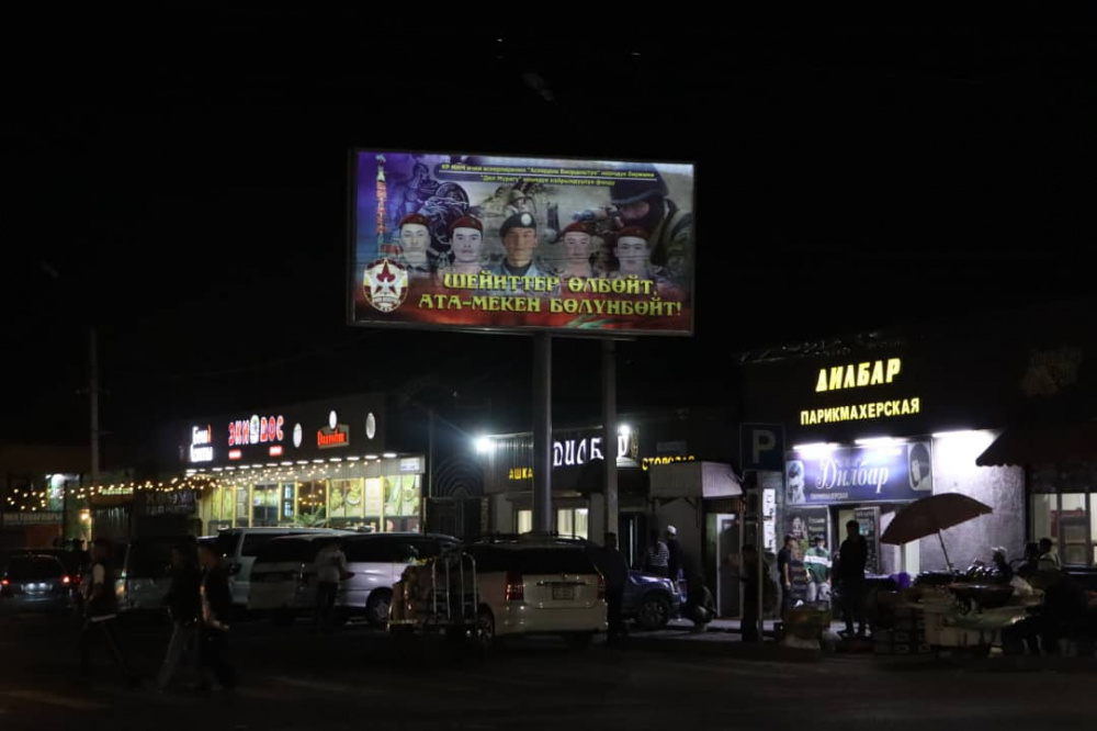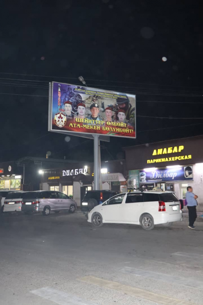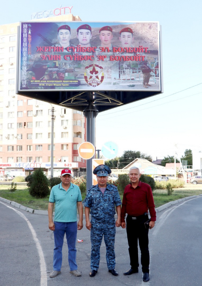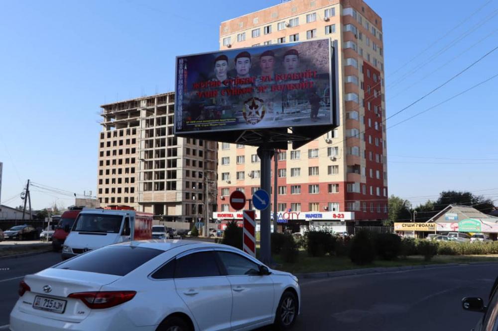 Баткен облусундагы кыргыз-тажик чек арасындагы куралдуу чыр-чатактан улам курман болушкан аскер кызматкерлери менен милиционердин жаркын элесине арналып Бишкекте баннерлер орнотулду.