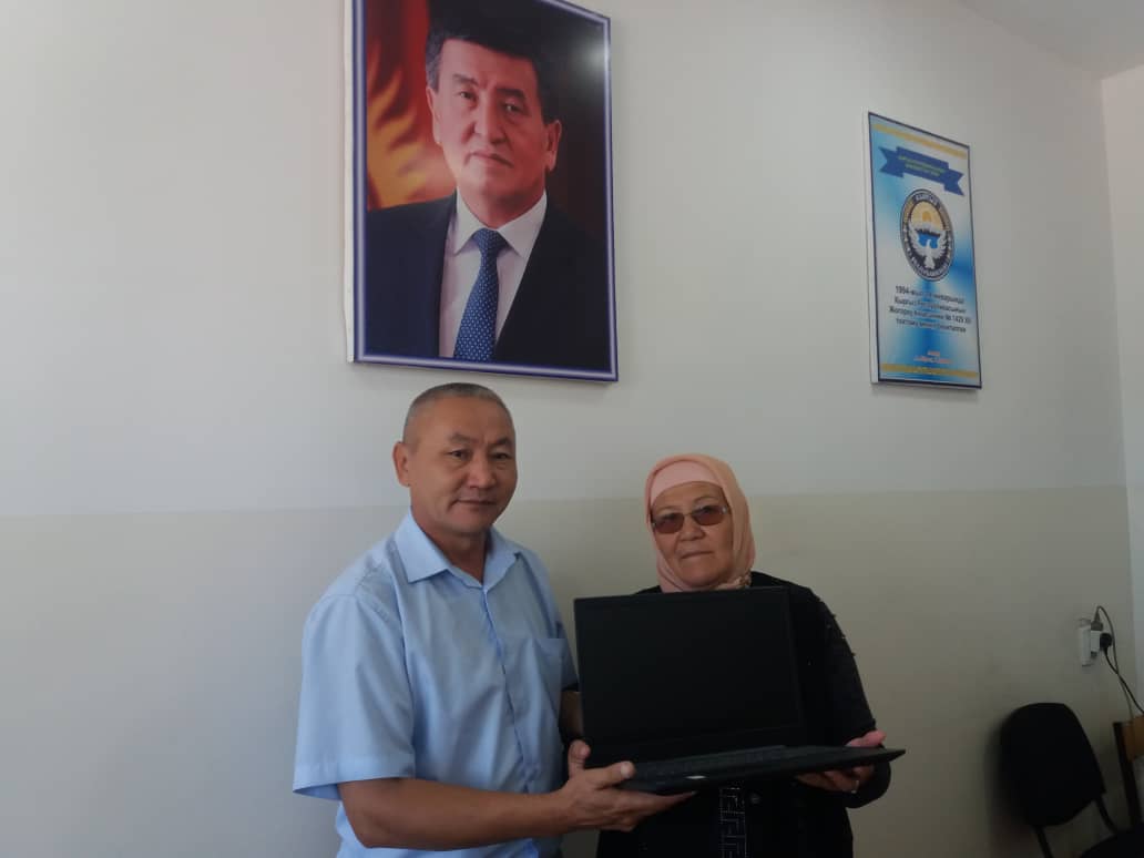 Билим берүү жана илим министри Каныбек Исаков, Баткен районундагы Муса Кадыр атындагы орто мектебинин башталгыч класс мугалими Миргүл Эшимовага өз айлык акысынан ноутбук белек кылды.