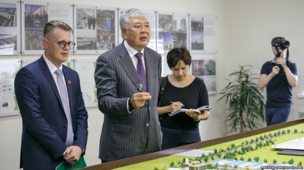 Даниил Урицкий - Данияр Үсөнов (солдон үчүнчү) “Беларус улуттук биотехнология корпорациясына" (БНБК) тиешелүү курулушту расмий баштоо аземинде. Сүрөт булагы: “TUT.BU” интернет басылмасы. 27.7.18.