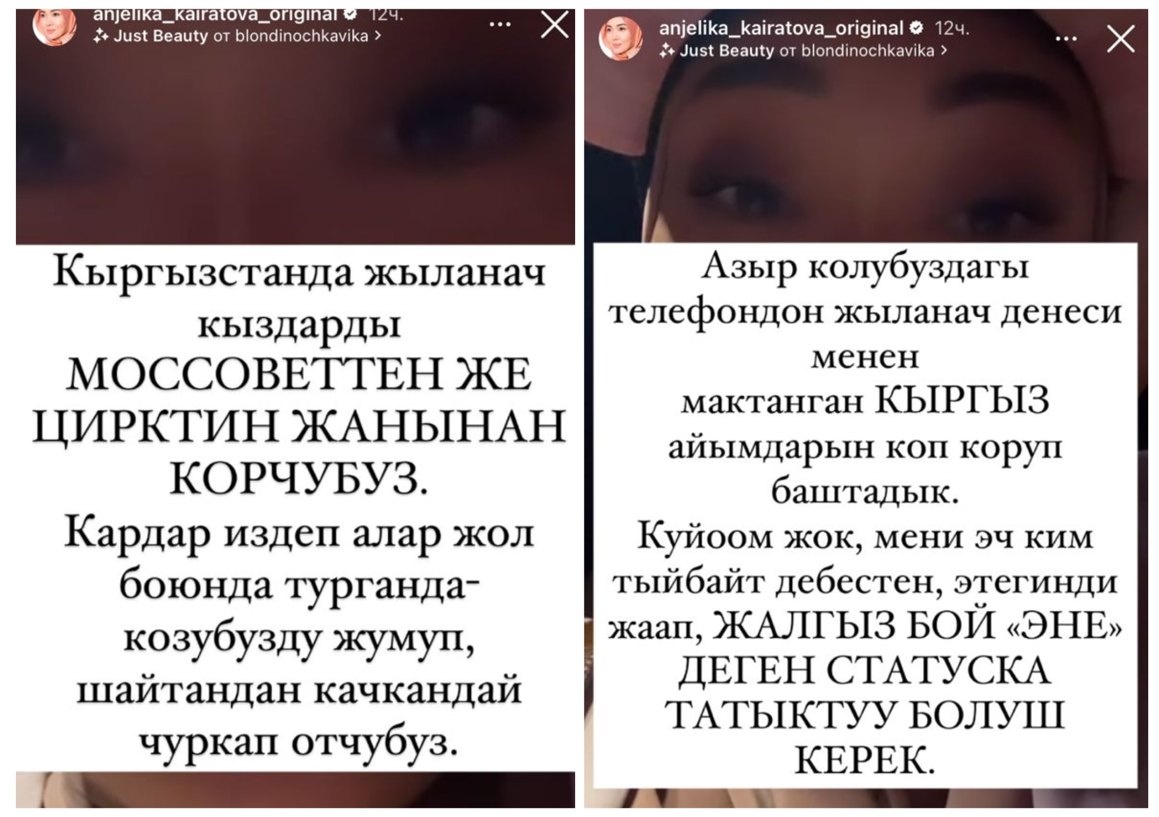 --Кыргызстанда жылаңач кыздарды Моссоветтен же цирктин жанынан көрчүбүз. Кардар издеп алар жол боюнда турган көзүбүздү жумуп, шайтандан качкандай чуркап өтчүбүз. Азыр колубуздагы телефондон жылаңач денеси менен мактанган кыргыз айымдарын көп көрүп баштадык. Күйөөм жок, мени эч ким тыйбайт дебестен, этегиңди жаап, жалгыз бой "эне" деген статуска татыктуу болуш керек, - деп жазган Анжелика.