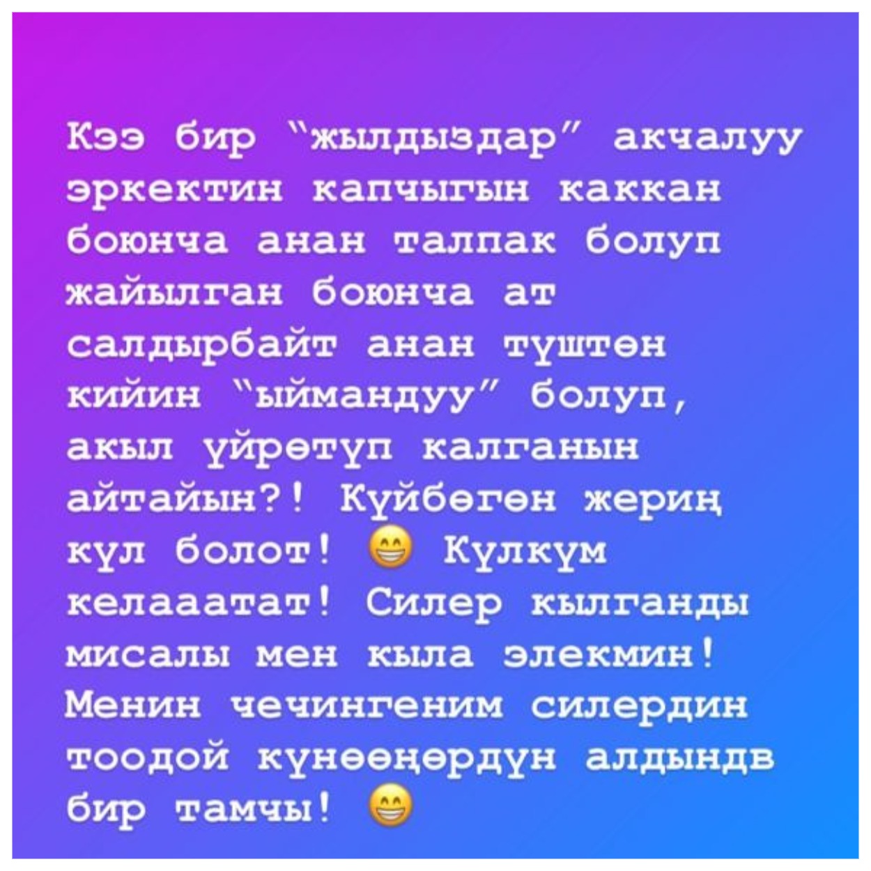 --Кээ бир "жылдыздар" акчалуу эркектин капчыгын каккан боюнча анан талпак болуп жайылган боюнча ат салдырбайт, анан түштөн кийин "ыймандуу" болуп, акыл үйрөтүп калганын айтайын?! Күлкүм келеааатат! Силер кылганды мисалы мен кыла элекмин! Менин чечингеним силердин тоодой күнөөнөрдүн алдында бир тамчы!, - деп жооп берген.