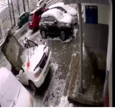 Орусиянын жергиликтүү басылмалары жазып чыкты. Анда унаанын жанында турган адам кире беришке токтоп, аны кардан тазалагысы келип жаткандыгы тартылган. Бир аз убакыттан кийин, ал чатырдан бир нерсе түшүп жатканын байкап, унаанын артынан секирип үлгүрөт. Бир секунддан кийин, бетон плитасы унаанын чатырына түшүп, жарымына чейин кирип кеткен.