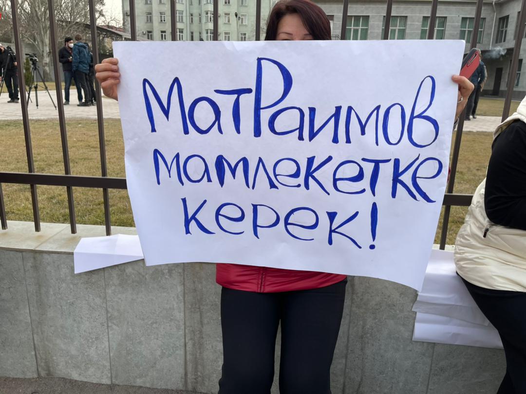 -- "Биз буга чейин бир нече митингдерге катышып келгенбиз. Бүгүн бизди 1-май райондук сотунун алдында Райымбек Матраимовду күтүп турабыз. 100дөн ашуун тарапташтарды алгач укук коргоо кызматкерлери атайын тосмодон киргизбегенге аракет кылышты. Бийлик Матриамовго бут тосуп жатат. Атамбаевдин тарапташтары соттун ичине чейин кирип ызы-чуу кылышат. Бизге эмне мындай мамиле кылышат, тартышып атып араң кирдик", - дейт жеринен Ыргалай Бекмуратова.