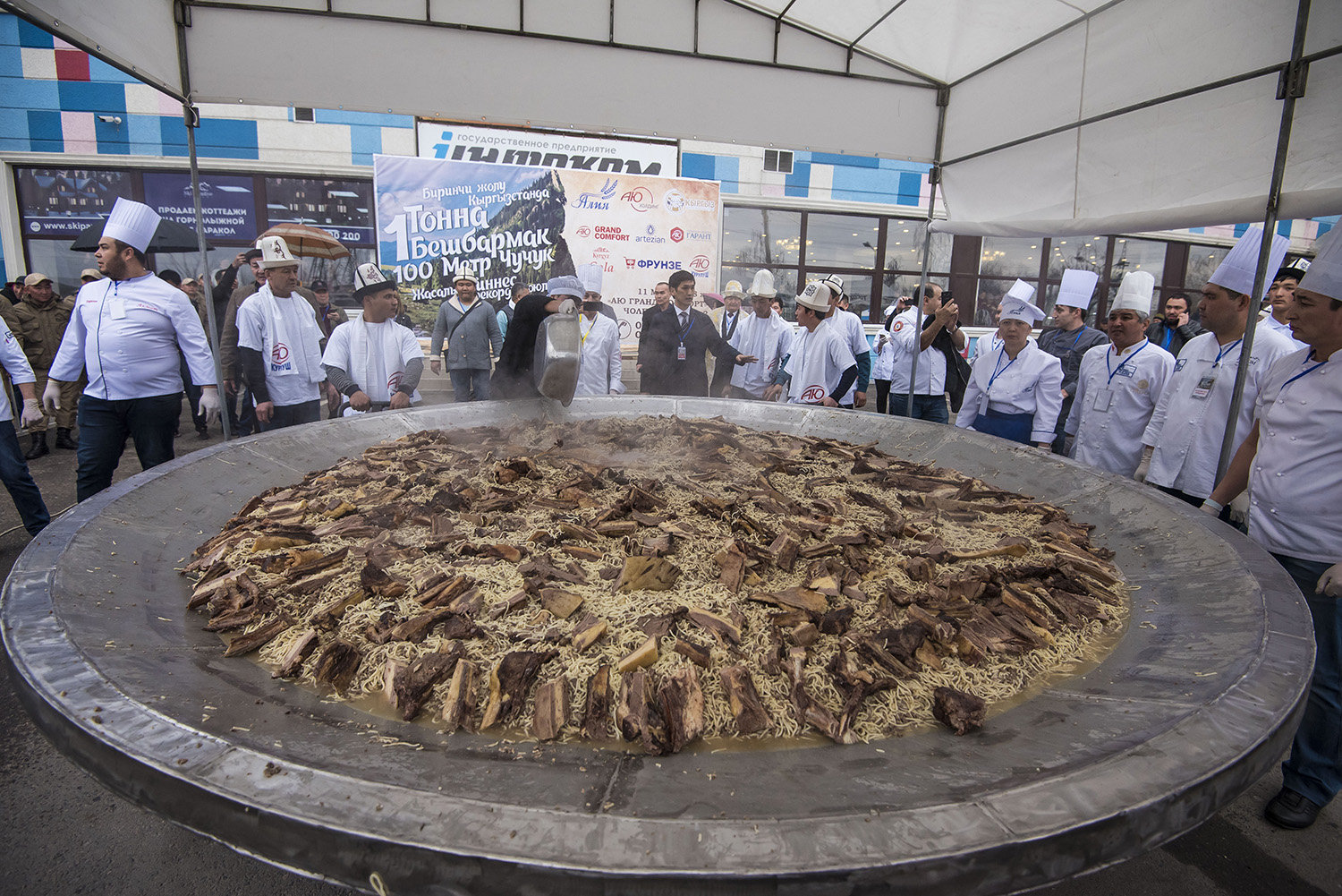 Бешбармакты жасоого 40 ашпозчу, 30 жардамчысы менен кошулуп жалпы жонунан 70 ашпозчу тартылган. Аны даярдоого 650 килограмм таза тууралган эт, 700 килограмм камыр кетти. Камыр менен эт алдын ала чакан казандарда бышырылган. Ал эми чучукту эт азыктарын кайра иштеткен компаниялардын бири жасап келген. Натыйжада пландалгандан ашып түшүп бешбармактын салмагы 1464 килограммга чыкса, чучук 117 кулачты түздү. Даяр болгон тамактар келген элге жана муктаж үй-бүлөлөргө таратылып берилди.