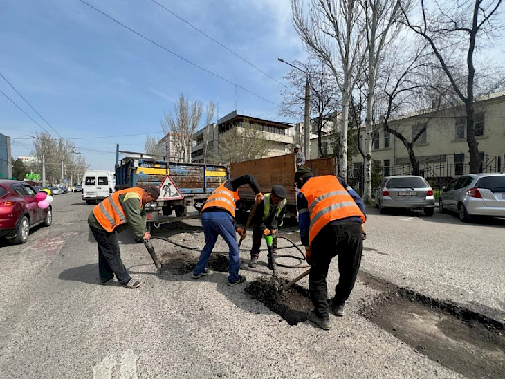 Муниципалитеттен билдиришкендей, учурда Курманжан Датка көчөсүн бойлой Жибек-Жолу проспектисинен Чүй проспектисине чейин чуңкурларды оңдоо иштери жүрүп жатат.