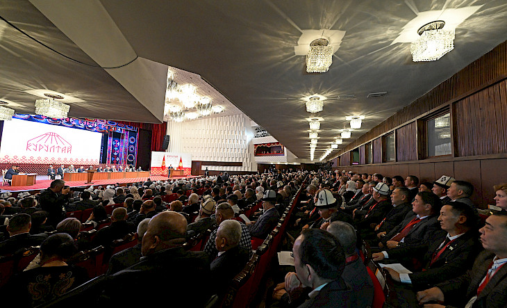 Бишкектеги Токтогул Сатылганов атындагы улуттук филармонияда президент Садыр Жапаровдун катышуусунда өтүп жаткан биринчи Элдик курултай өз ишин улантууда.
