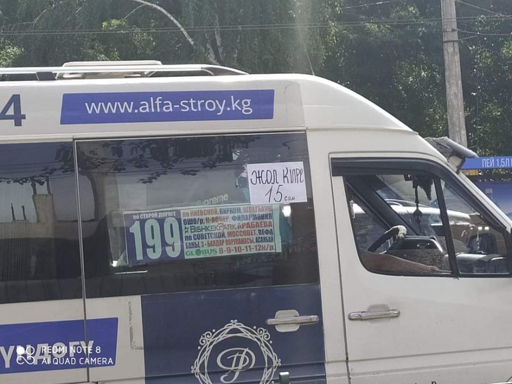 Сүрөттө көрүнгөндөй, №199 маршруттук каттамдын айдоочусу унаасынын сыртына "Жол кире 15 сом" деп жазып алган. Бул сүрөт учурда социалдык тармактын колдонуучулары тарабынан талкууга алынууда.