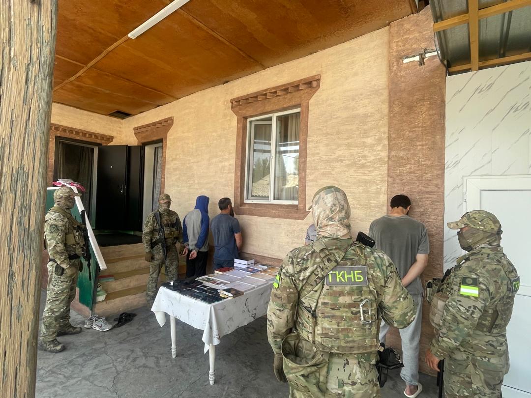 Жыйынтыгында катталбаган диний адабияттар, экстремисттик символика, 1 ок атуучу граната, ар кандай маркировкалары бар 3 патрон, 1 жылмакай мылтык, 1 страйкбольный привод (м16/М4 автоматынын аналогу), 1 сигналдык пистолет, 2 пневматикалык пистолет, акча каражаттары, бычактар, кылыч, байланыш каражаттары, радикалдуу мазмундагы аудио — жана видеоматериалдар алынды.