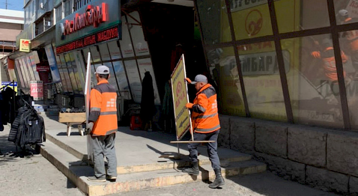 Эскерте кетсек, «КР мамлекеттик тили жөнүндө” мыйзамынын талаптарына жооп бербеген жана уруксатсыз орнотулган жарнамалар алынууда жатат.