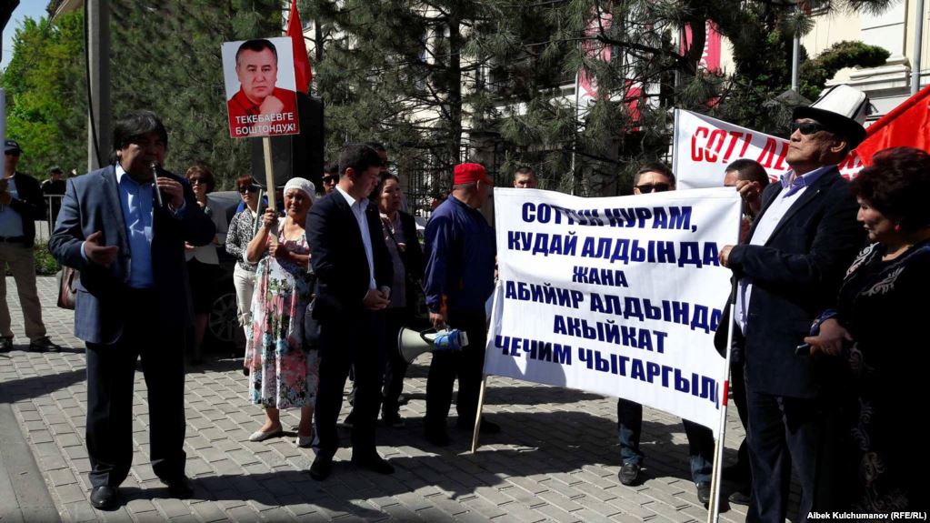 "Ата Мекен" партиясынын лидери Өмүрбек Текебаев "Мегаком" компаниясына байланыштуу жемкорлукка шектелип 26-февралда кармалган жана Улуттук коопсуздук боюнча мамлекеттик комитетинин убактылуу кармоочу жайына эки айга камалган. 21-апрелде Бишкектин Биринчи Май райондук соту анын темир тор артындагы мөөнөтүн дагы бир айга узарткан. Буга нааразы болгон адвокаттары шаардык сотко апелляциялык арыз жазышкан.