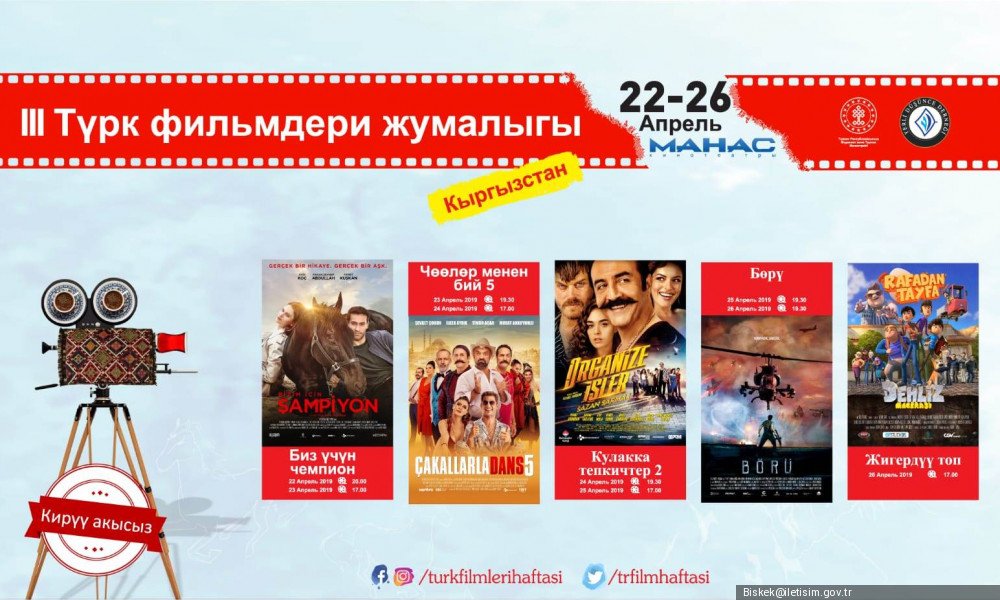 Түрк кинолорунун Кыргызстандагы жумалыгынын алкагында “Манас” кинотеатрында Түркияда эң мыкты делген кино тасма көрсөтүлөт. Алар:“Кулакка тепкичтер-2“, “Чөөлөр менен бий-5”, “Бөрү”, “Биз үчүн чемпион” жана “Жигердүү топ” кино тасмасы.