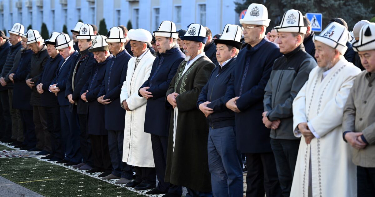 Президент Садыр Жапаров бүгүн, 21-апрелде, Бишкектин эски аянтында ыйык Орозо айт майрамына байланыштуу айт намазга катышты.