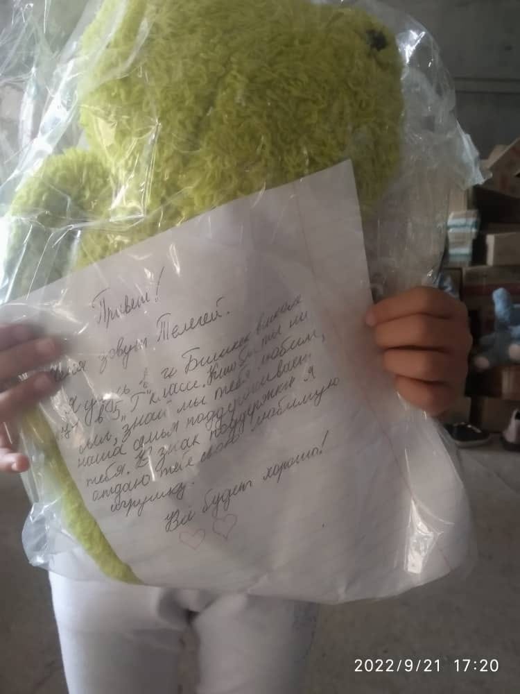 Бүгүн менин кат куржунума Баткенден көздүн жашын агыза турган кубанычтуу сүрөттөр келди. Сүрөттөгү оюнчукту Бишкектен 5-класстын окуучу кызы Телегей Баткенге жөнөткөн. Бүгүн дарегин тааптыр. Биздин жаштар ушундай тарбия менен чоңойсо өлкөбүз эч качан артка кетпейт, чөгөлөбөйт! Мындай билдирүүнү активист Бекжан Шыгаев Фейсбуктагы баракчасында жазып, Бишкек шаарынын кичинекей тургунунун катын тиркеген.