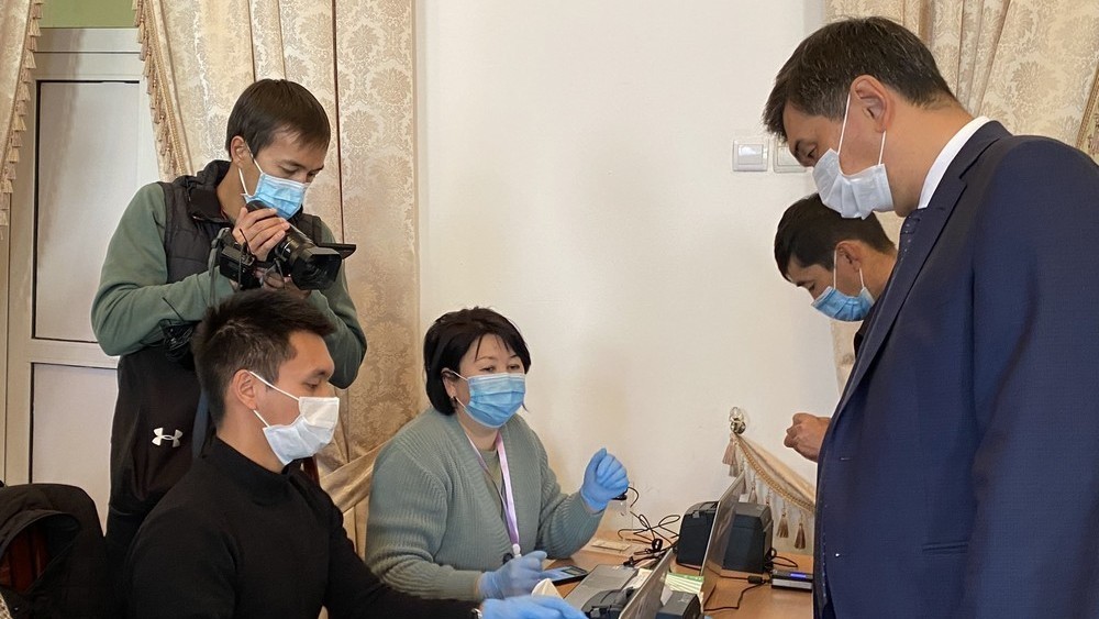 «Бир аз кезек күтүү болду. Шайлоо участогуна кирип жаткан адамдардын дене табын өлчөп, шайлоочунун бет кабы жок болсо, ошол жерден берип жатышат», - деп билдиришти мэриядан.
