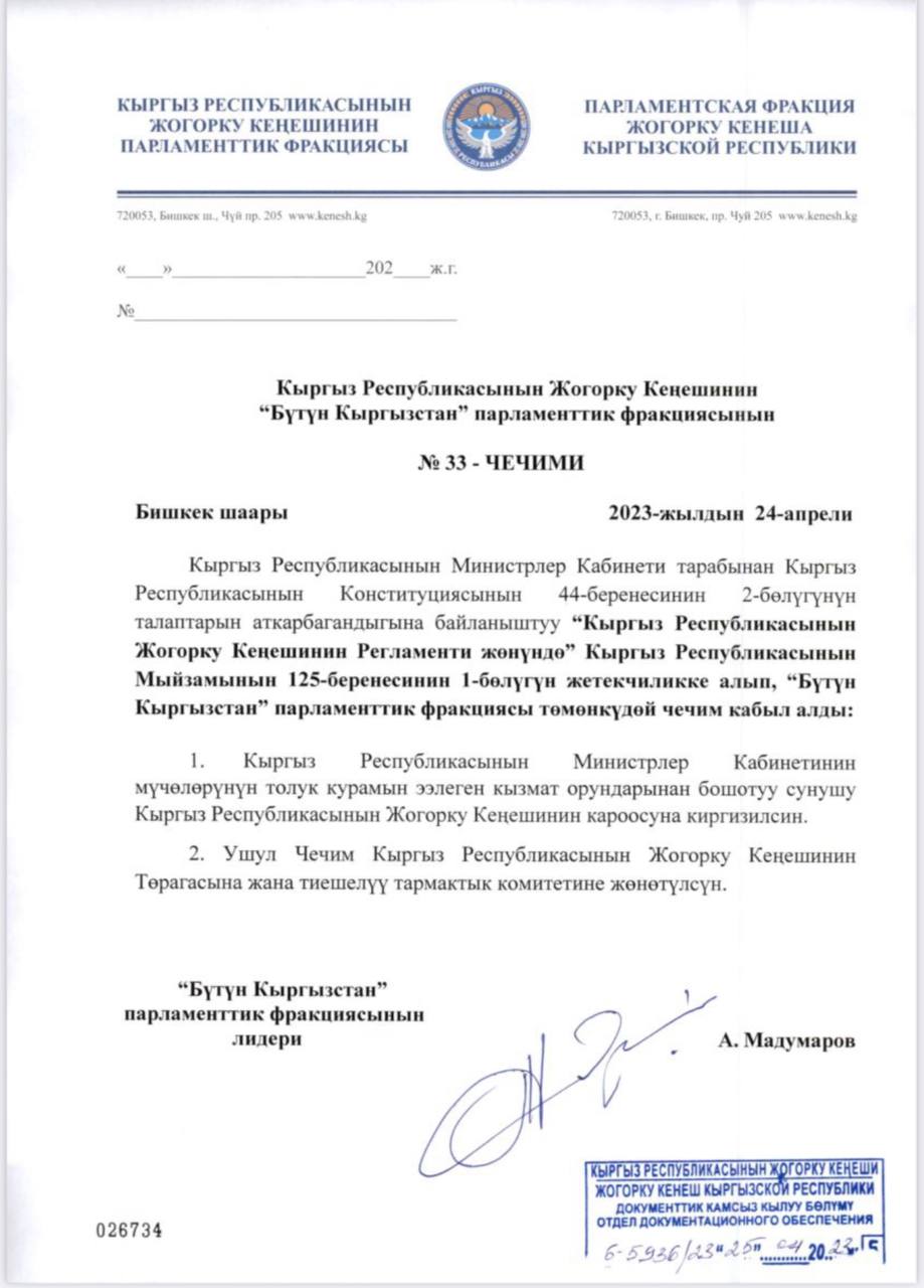 «Бүтүн Кыргызстан» фракциясы Акылбек Жапаров баштаган Министрлер кабинетин толугу менен кызмат орундарынан бошотууну сунуштады.