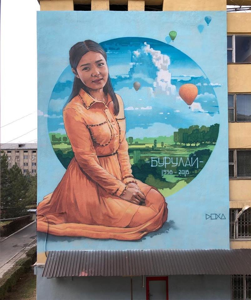 "Портрет «Бурулай Турдалы Кызы» 1998 - 2018. на фасаде общежития Бишкекского медицинского колледжа по улице Логвиненко 18. Мы думаем, что все знают трагическую судьбу этой прекрасной девушки.. Работа призвана обратить внимание общественности к проблеме гендерного насилия, в частности насилия в отношении женщин и девочек и призывает общество к искоренению пагубной практики похищения женщин и девочек с целью вступления в брак. Так же работа даёт старт мероприятиям общенациональной компании организованной общественным объединением «Центр помощи женщинам», это компания проходит ежегодно в течении 16 дней с 25 ноября , в Международный день борьбы в отношении женщин, по 10 декабря , Международный день прав человека, к слову данная работа так же выполнена по инициативе этой организации."