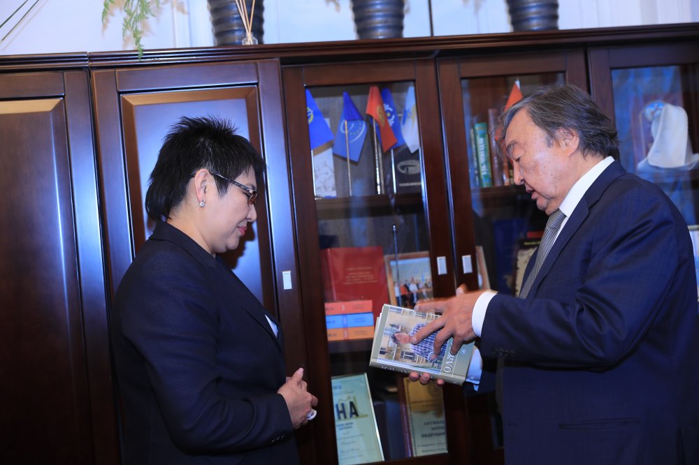 Сыйлык тапшырган соң Жогорку Кеңеш төрагасынын орун басары Асел Кодуранова Олжас Сулейменов менен баарлашып, эстеликке сүрөткө түштү.