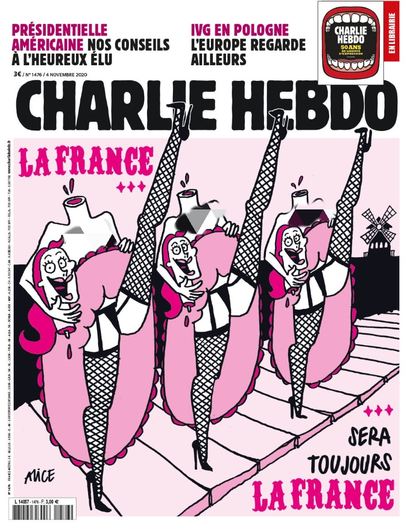 Карикатурада баштары кесилген жылаңач төш кабаре бийчилеринин сүрөтү түшүрүлгөн. Ошол эле учурда, алар баштарын колтук алдында кармап, жүздөрүндө кубанычтуу жылмайуу бар. Сүрөттөгү жазуу "Франция ар дайым Франция бойдон кала берет" деп жазылган. Сюжет акыркы окуяларга байланыштуу: 29-октябрда Тунистин тургуну, "Аллаху Акбар" деп кыйкырып, Ниццадагы чиркөөдөгү адамдарга бычак менен кол салган. Ал үчөөнү өлтүрүп, курман болгондордун бирин башын толугу менен алганга жетишкен.
