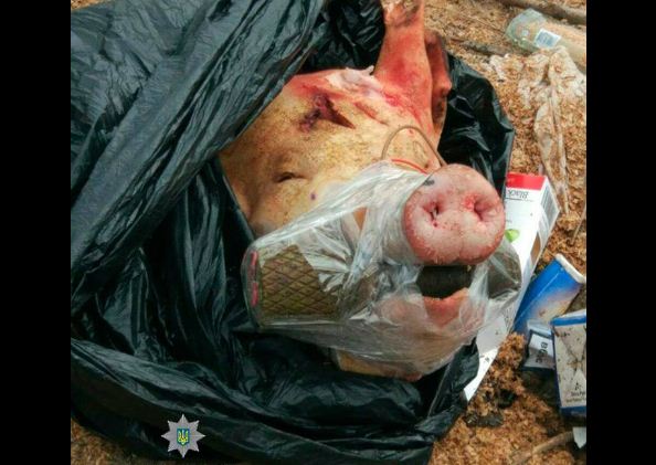 Орусиянын Запорожье аймагында аялдамалардын биринде коомдук транспорттук жайда белгитсиз бирөөлөр чочконун башы менен бирге анын оозуна граната менен баштыкка салып таштап кетишкен. Бул тууралуу областтык патрулдук полициясынын пресс-кызматы Фейзбук баракчасында маалымадалат.
