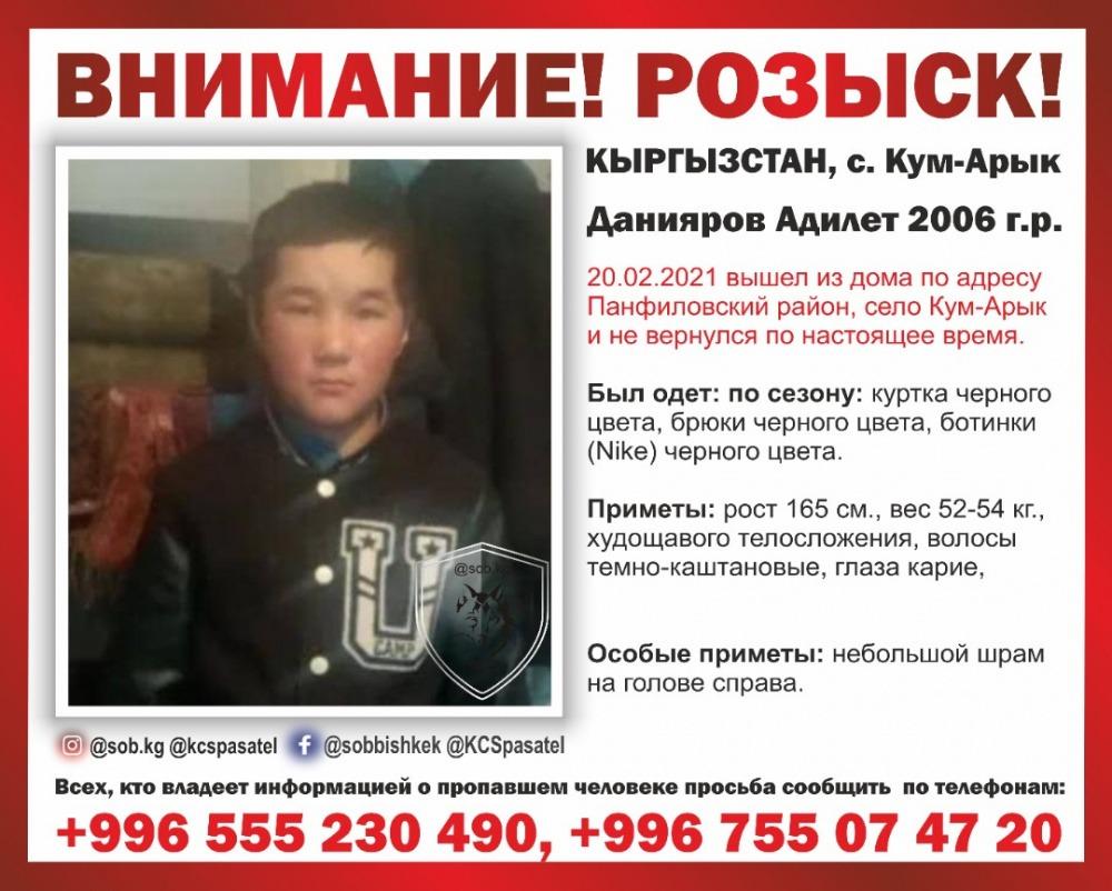 Чүй облусунун Панфилов районунда 15 жаштагы Адилет Данияров атту өспүрүм дайынсыз болуп изделүүдө. Бул тууралуу Коомдук коопсуздук кеңешинен кабарлашты.