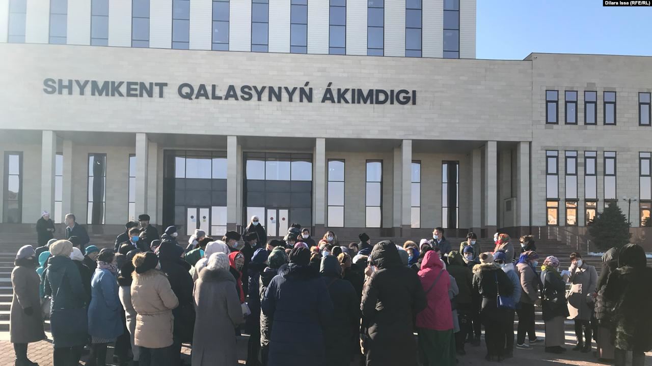 Казакстандын Чымкент шаарында ондогон аял социалдык маселелерин чечип беришин талап кылып акимчилик алдына чогулду.