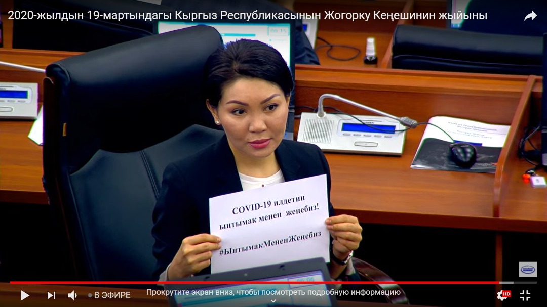 Ал эми Жогорку Кеңештин парламентинин депутаттары жыйында "COVID-19 илдетин ынтымак менен жеңебиз!" деген жазууларды колдоруна кармап алышкан.