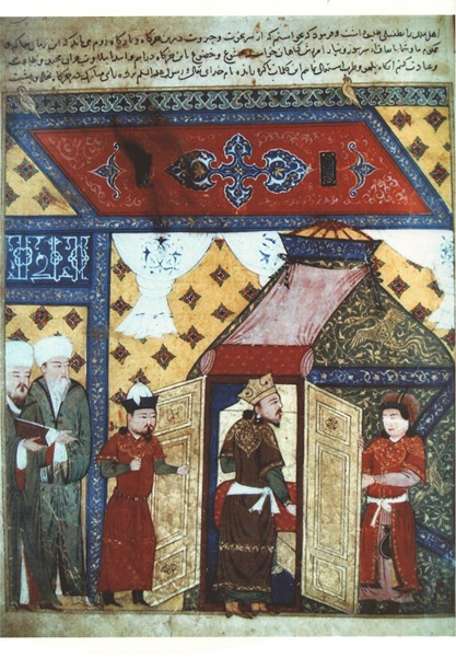 Эми сиз айткан сүрөттөргө көңүл буралык. Төртүнчү сүрөттө (87 бет) 1265 ж. 1282 жылга чейин 17 жыл Ирандын Эл ханы Абага хандын такка олтурушу көрсөтүлгөн. Ал атасы Хулагу менен Иранга 1256 жылы келген. Хулагу Чыңгызхандын небереси, кенже уулу Тулуйдун үчүнчү баласы.