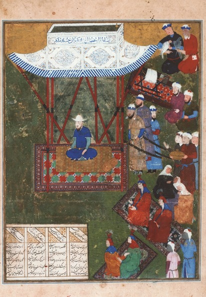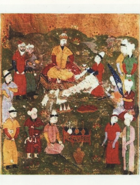 рландын небереси, Шахрухдун уулу Улугбек 1405 – 1449- жылдары бийлик жүргүзгөн. Сүрөт 1425-1450 жылдар аралыгында тартылган. Улугбектин аялдары монголчо кийинген. Анын 2 уулу жана 3 генералы ак калпак кийиип турат. (сүрөткө түшүндүрмө 98- бетте).