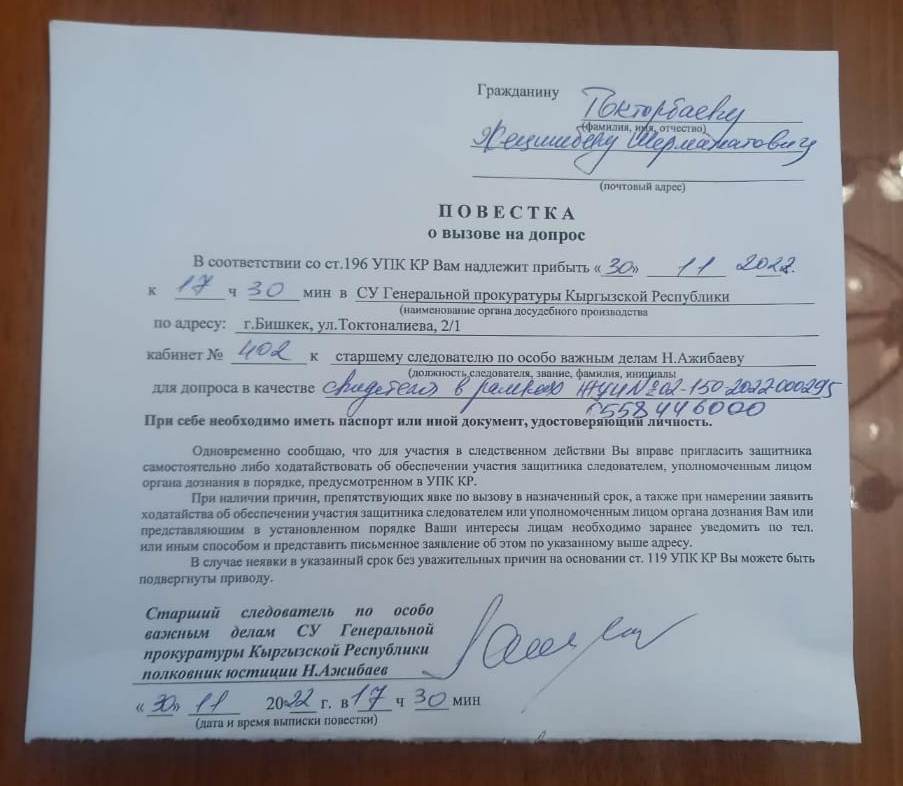 Маалыматка ылайык, Токторбаев күбө катары суракка чакырылды.