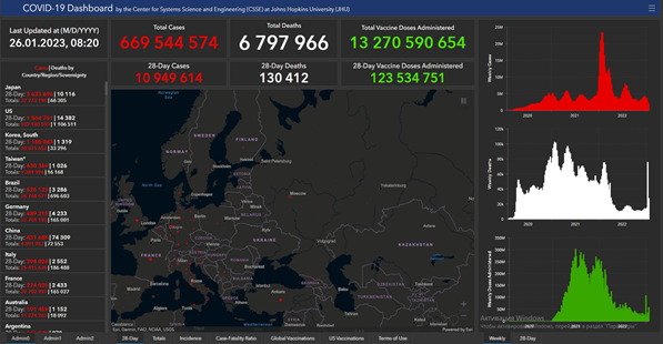 Жалпысынан пандемия башталгандан бери дүйнөдө 669 миллион 544 миң 574 адам коронавирус жуктурган. Баарынан да АКШ (102 миллион 180 миң 592), Индия (44 миллион 682 миң 206), Бразилия (36 миллион 768 миң 677), Франция (39 миллион 702 миң 995), Улуу Британия (24 миллион 492 миң 72) , Россия (21 миллион 601 миң 76), Түркия (17 миллион 42 миң 722), Аргентина (10 миллион 32 миң 709), Иран (7 миллион 563 миң 728), Колумбия (6 миллион 348 миң 356), Испания (13 миллион 722 миң 677 ), Италия (25 миллион 415 миң 630) жана Германия (37 миллион 701 миң 193).