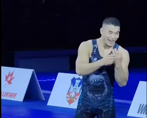 Махмудов алтын медаль үчүн беттеште венгриялык атаандашын жеңгенден кийин жеке машыктыруучусу Мейрамбек Ахметовго оң колунун аты жок манжасын көрсөткөн.