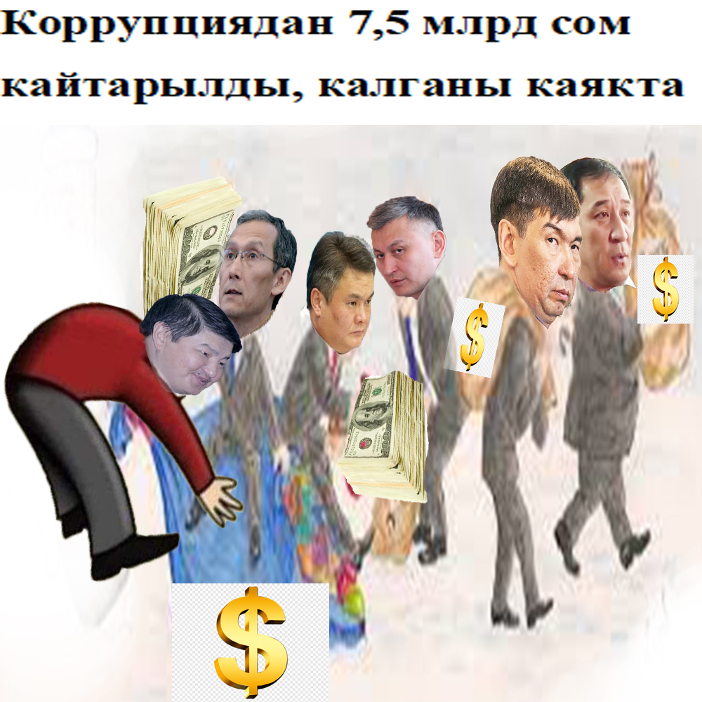 Коррупция боюнча Жогорку Кеңештин мурдагы депутаты Марат Аманкулов 50 млн сом, Жалил Атамбаев 100 млн сом, депутат Абжалиев 50 млн сом, Жогорку Соттун судьясы Осмоналиев 70 млн сом (жалпы 114 млн 299 миң сом төгөт), Бажы кызматынын Түштүк аймак башкармалыгынын башчысы Айтмаматов 74 млн сом (дагы 26 млн сом калган), вице-мэр Уланбек Азыгалиев 25 млн сомду мамлекеттин эсебине төлөшкөн. Андан тышкары кызмат абалынан кыянаттык менен пайдалануу боюнча Каржы полициясынын мурдагы башчысы Таиров 20 млн, Каржы полициясынын төрагасынын мурдагы орун басары Жамгырчиев 20 млн сом төлөп берген.