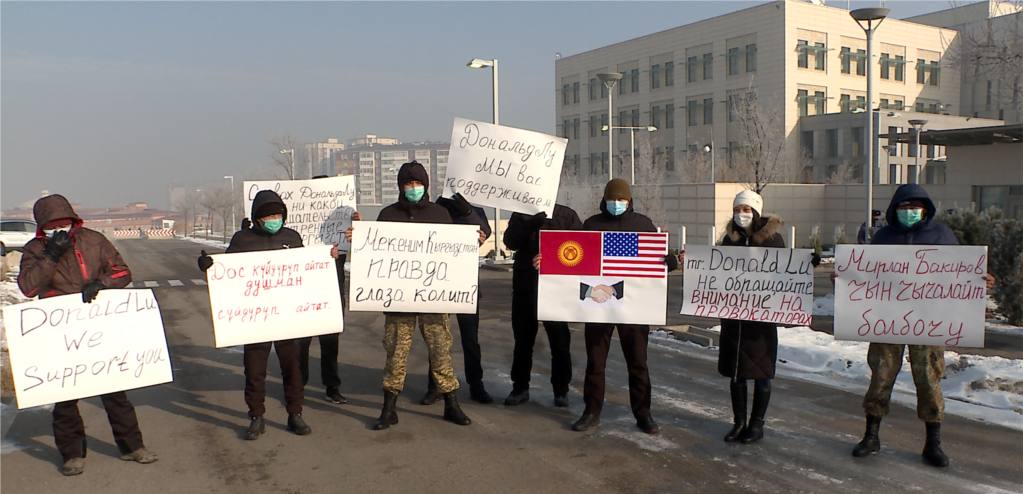 11-декабрда АКШнын Кыргызстандагы элчилигинин имаратынын астына он чакты адам пикетке чыкты. Алар «Чын чычалайт», «Дос күйдүрүп айтат, душман сүйдүрүп айтат», «Дональд Лу, биз сизди колдойбуз» деп жазылган плакаттарды көтөрүп турушту.
