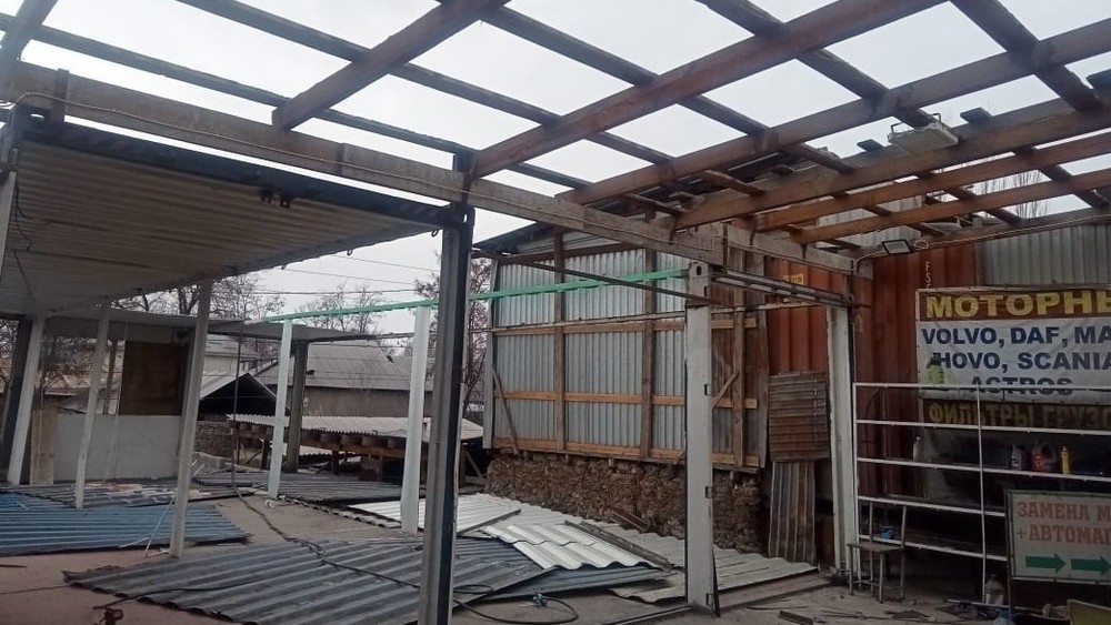 Бишкек шаарынын мэриясынын жер пайдаланууну контролдоо боюнча башкармалыгы «Дордой» базарынын түндүк тарабындагы жол жээгиндеги объекттерди бузуп жатат.