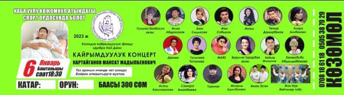 Ошондой эле 6-январда Бишкектеги Каба уулу Кожомкул атындагы Спорт ордосунда кайрымдуулук концерти өтөт. Концерт саат 18:30да башаталат.