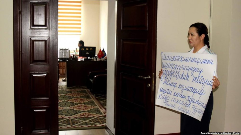Мамлекеттик экологиялык жана техникалык коопсуздук боюнча инспекциясынын маалымат катчысы Анара Мамбеталиева иштен мыйзамсыз алынганына даттанып, мекеменин имаратынын ичинде пикет өткөрдү. Бул тууралуу ал “Фейсбуктагы” баракчасына жазып, плакат кармаган сүрөттөрүн жайгаштырды.