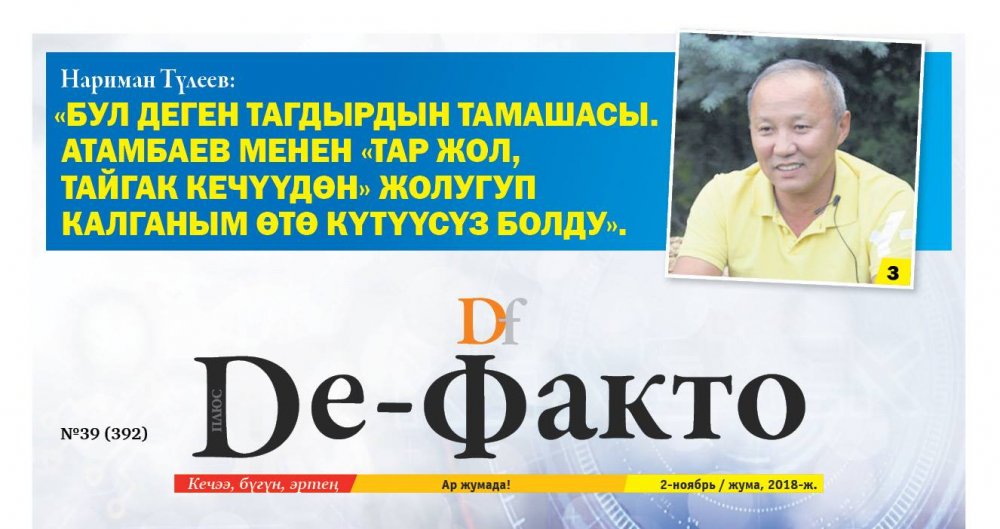 Редакциядан: «Де-факто» гезитинин кийинки санында «селфи» кылуу максаты, Түлеевдин камалышына кимдер кызыкдар болгону, ошондой эле ТЭЦ маселеси менен камалгандар тууралуу Атамбаевдин эмне дегенин окуй аласыздар…