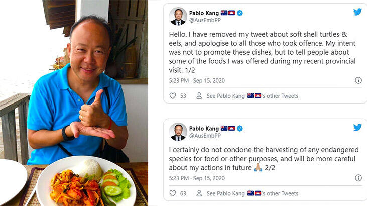 Австралиянын Камбоджадагы элчиси Пабло Кангдын социалдык тармакка тукуму азайып бараткан таш баканы жеген сүрөтүн бөлүшүүсү өлкө ичинде нааразычылык жаратты. Австралиялык дипломат Пабло Кангдын жумшак кабыктуу таш баканы жеп жаткандагы сүрөтүн социалдык тармакта жарыялаган. Австралиялык жаныбар укугун коргоо уюмдарынын мүчөлөрү тарабынан келген реакцияларга бет келген дипломат Канг: “Салам. Жумшак кабыктуу таш бака жана жылан балыктар ууралуу постумду өчүрдүм. Буга нааразы болгондордун баарынан кечирим сурайм. Ниетим тамактарды таанытуу эмес, адамдарга иш сапар учурунда мага берилчү тамактардын айрымдарын көрсөтүү гана болчу”, - деди.