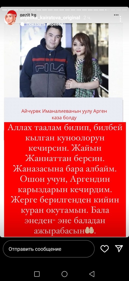 --"Аллах таалам билип, билбей кылган күнөөлөрүн кечирсин. Жайың Жаннаттан берсин Жаназасына бара албайм. Ошон үчүн Аргендин карыздарын кечирдим", - деп жазган Анжелика.