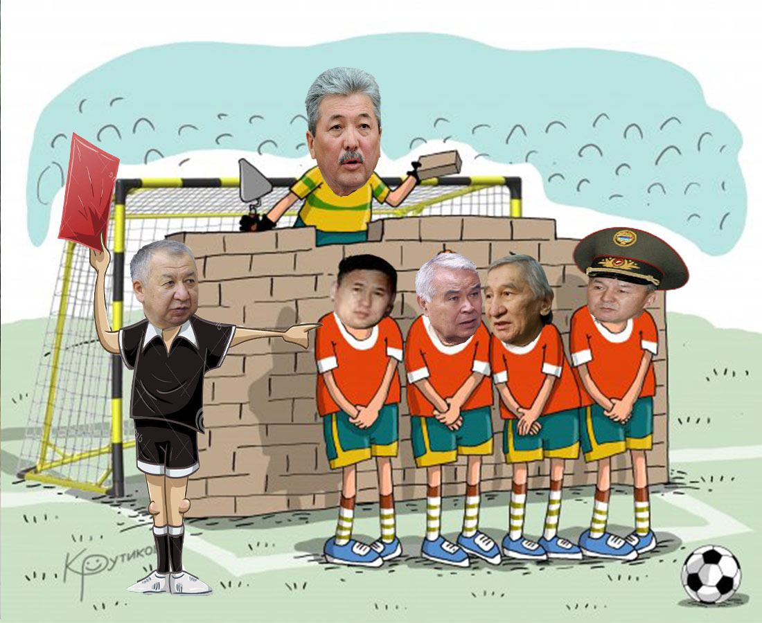 Жакында бийлик менен оппозициялык кеңештин ортосунда футбол боюнча чоң тирешүү болуп өттү. Бийлик тарабында президент баш болуп монтоңдогон «монстрлар»: Адылбек Касымалиев, Бакыт Төрөбаев, Алмаз Бакетаев, Алмаз Бейшеналиевдер, оппозиция тарабында Бекболот Талгарбеков баш болгон Мамбетжунус Абылов, Назаркул Жоошбаев, Исмаил Исаков, Төрөбай Колубаев, Элмира Ибраимовалар. Калыс: Кубатбек Боронов.