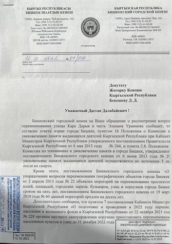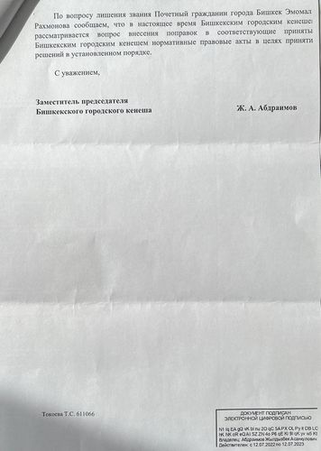 «Ошого карабастан, Бишкек шаардык кеңеши мага Эмомали Рахмондон наамды алып салуу механизмдери азырынча иштелип чыга элек деген жооп жөнөттү», - деди ал.