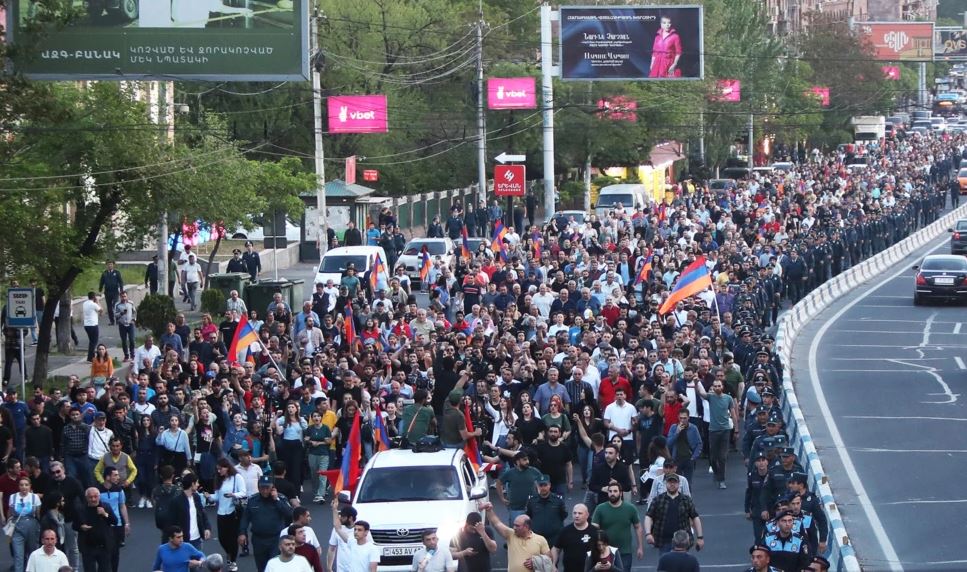 Демонстранттардын бир бөлүгү 26-апрелде кош бойлуу аялдын каза болгонуна нааразылыгын билдиришүүдө. Аны Пашиняндын кортежиндеги автоунаалардын бири сүзүп кеткен.