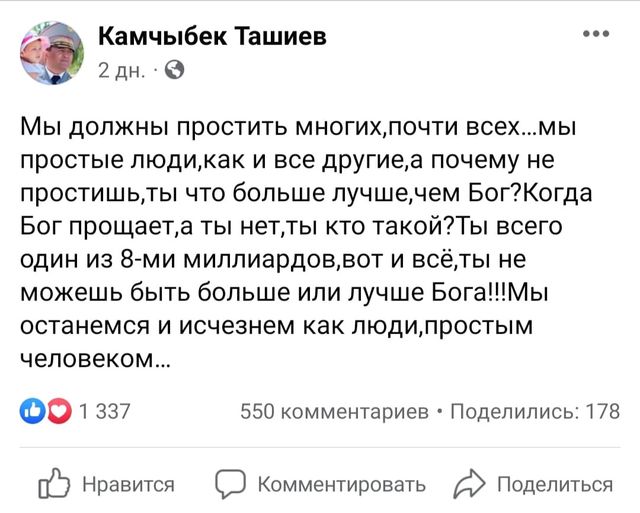 Кудайга үнүбүз жетсе пенде кайда качмакпыз. Камчыбек Кыдыршаевич айтмакчы, падыша баш болуп Кудай алдында баарыбыз окшош пендебиз! Дегеним, Камчыбек Ташиев бийликке келе электе Кемпир-Абад боюнча бийликке койгон талабына жолдошум Эрландын жана Кемпир-Абадды коргоп камакта жаткан саясий туткундардын бийлик өкүлдөрүнө айткан сындары окшош. Демек, Камчыбек Кыдыршаевич бул ишти жакындан билген үчүн, Кемпир-Абад боюнча ИИМдин жасалма токуган ишин УКМК жетекчиси катары токтотууну колго алды деп түшүнүп, үмүт арттым", - деп жазып, УКМКнын төрагасы Камчыбек Ташиевдин буга чейин социалдык тармакка жазган акыркы постун тиркеп койгон.