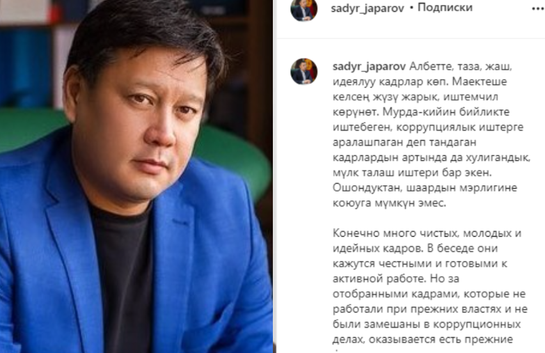 Анын айтымында Садыр Жапаровдун мэрлик кызмат боюнча билдирүүсү жарыяланган социалдык баракча фейк баракча.
