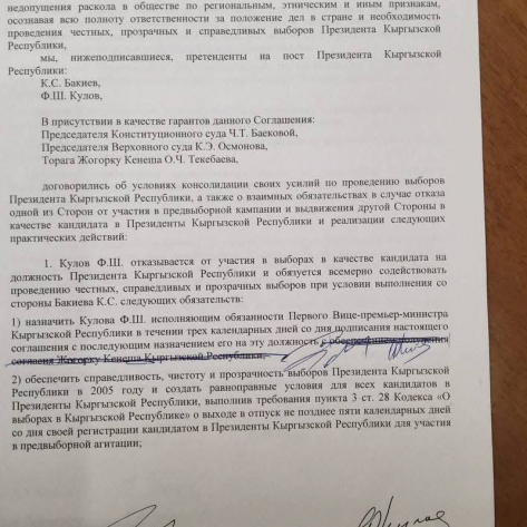 - Келишимде мындай пункт бар эле: Эгерде Бакиев президент болуп шайланса, ал мени премьер-министр кылып дайындайт. Мен бул кызматты ал президент болгон убакта ээлеп турмакмын. Бирок Бакиев кагаздагы бул сөздөрдү өз колу менен чийип койгон, - деди Кулов.