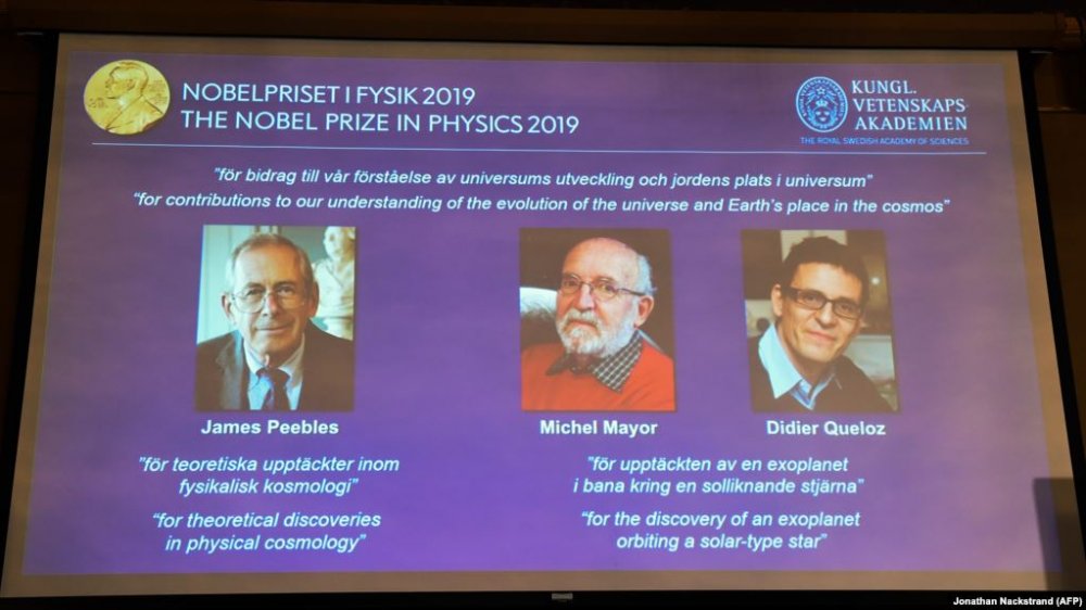 Стокгольмдо 8-октябрда Швециянын академиясы физика боюнча быйылкы Нобель сыйлыгын алгандарды атады. Ага ылайык, Жеймс Пиблс “физика космологиясындагы теоретикалык ачылыштар" эмгеги үчүн, Мишель Майор менен Дидие Келоз күн түрүндөгү жылдыздын тегерегинде айланган экзопланетанын ачылышы үчүн ушул сыйлыкка татыды.