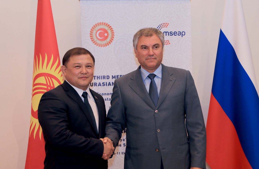 8-октябрда Түркияда өткөн Евразия өлкөлөрүнүн парламент төрагаларынын III жыйынынын алкагында Кыргыз Республикасынын Жогорку Кеңешинин Төрагасы Дастанбек Жумабеков Россия Федерациясынын Федералдык Жыйынынын Мамлекеттик Думасынын Төрагасы Вячеслав Володин менен жолугушту.